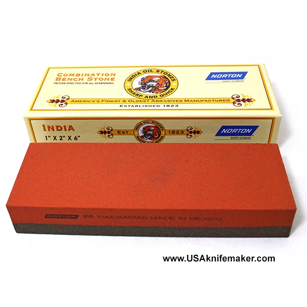 Norton INDIA stones are manufactured with aluminum oxide abrasives. Many prefer these AO based stones for imparting durable, smooth-cutting edges and for close tolerances. In orange or brown colors.