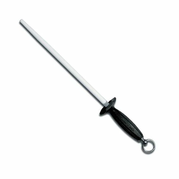 We are confident you have probably not handled a ceramic knife sharpening rod this size before unless you have worked in a well equipped commercial kitchen. This rod is 12โ long and with the handle the whole sharpener is 17โ long. Use ceramic sharpeners like this to hone the final edge on a slicing knife. The ceramic finish will restore a moderately dull edge but wonโt bring back a completely dull edge. Ceramics are for the final polish of an edge and the quick touch ups between sharpenings.